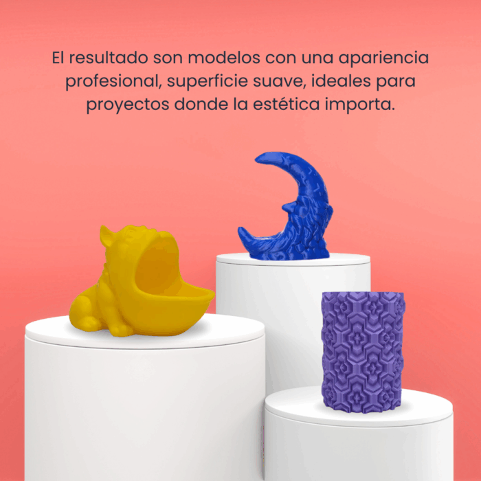 Maquetas, piezas decorativas, prototipos, modelos de presentación y cualquier impresión 3D de uso general donde quieras buen acabado mate y un flujo estable.